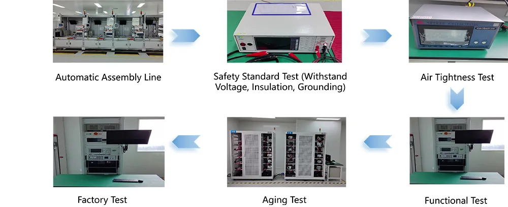 Het product heeft gezaghebbende certificeringen verkregen in binnen- en buitenland, waaronder CCC (China Compulsory Certification), CE (Europese Unie), UL (Verenigde Staten) en EN50498. Het voldoet aan de normen NB/T33001-2025 en GB31241-2014 en garandeert elektrische veiligheid en elektromagnetische compatibiliteit. We beschikken over een moderne productiebasis en gebruiken een vlamvertragende behuizing van ABS + PC-composietmateriaal met een V0-rating en FR-4 glasvezel printplaten. De belangrijkste soldeerverbindingen worden verwerkt met behulp van golfsoldeertechnologie en hebben strenge tests doorstaan, zoals 5.000 inbreng-/extractiecycli, trillingsbestendigheid en weerstand tegen zoutsproeicorrosie. Elke unit ondergaat een verouderingstest van 72 uur bij volledige belasting voordat deze de fabriek verlaat, waarbij een kwalificatiepercentage van 100% wordt behaald. We hebben een uitgebreid kwaliteitscontrolesysteem opgezet dat volledige traceerbaarheid mogelijk maakt, van de inkoop van grondstoffen tot de levering van het eindproduct.