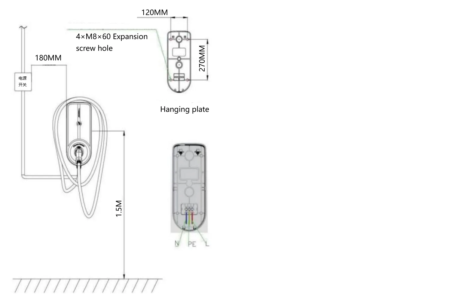 1) De referentiegegevens van de hoogte van de laadpaal vanaf de grond (1,3-1,5 meter) 2) Markeer de positie van het montagegat op de achterplaat op de muur volgens de positie van het montagegat op de achterplaat.